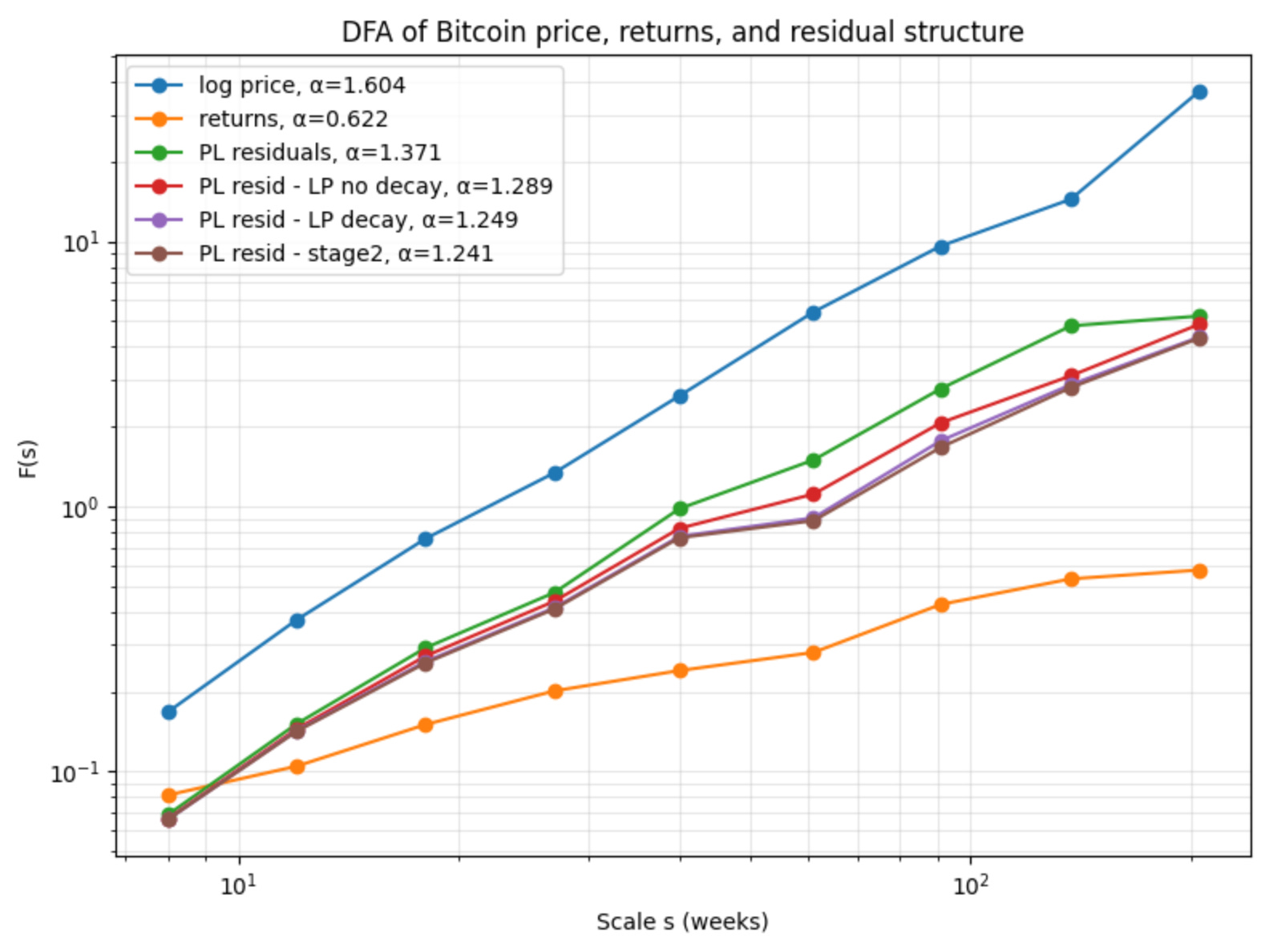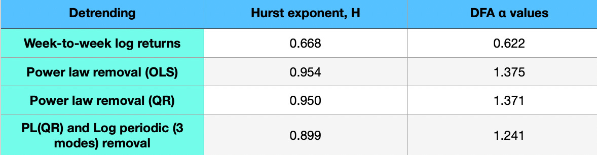 The results from the DFA analysis are also shown in Table 1, and in Figure 2. Even the log return α exponent is higher than typically seen in financial series at 0.62. But the real message is in the α values of 1.37 seen from the residuals after removing the power law, and around 1.25 for each of the three variants I ran that remove the log periodic modes as well. Those are quite high values, also indicating strong persistence for an integrated long-memory process, and confirming the Hurst R/S results.
