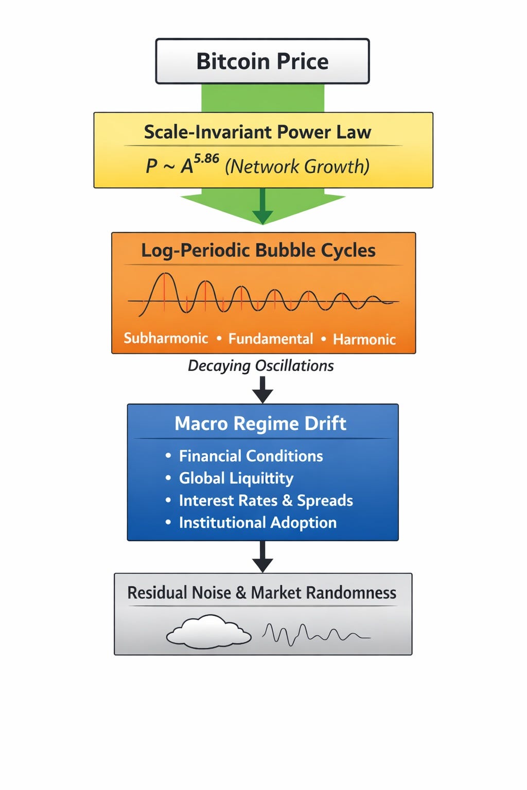 Once the power-law trend is removed, the first-stage residuals reveal a clear oscillatory structure. This can be modeled using log-periodic functions that capture the hierarchical timing of Bitcoin’s major bubble cycles.