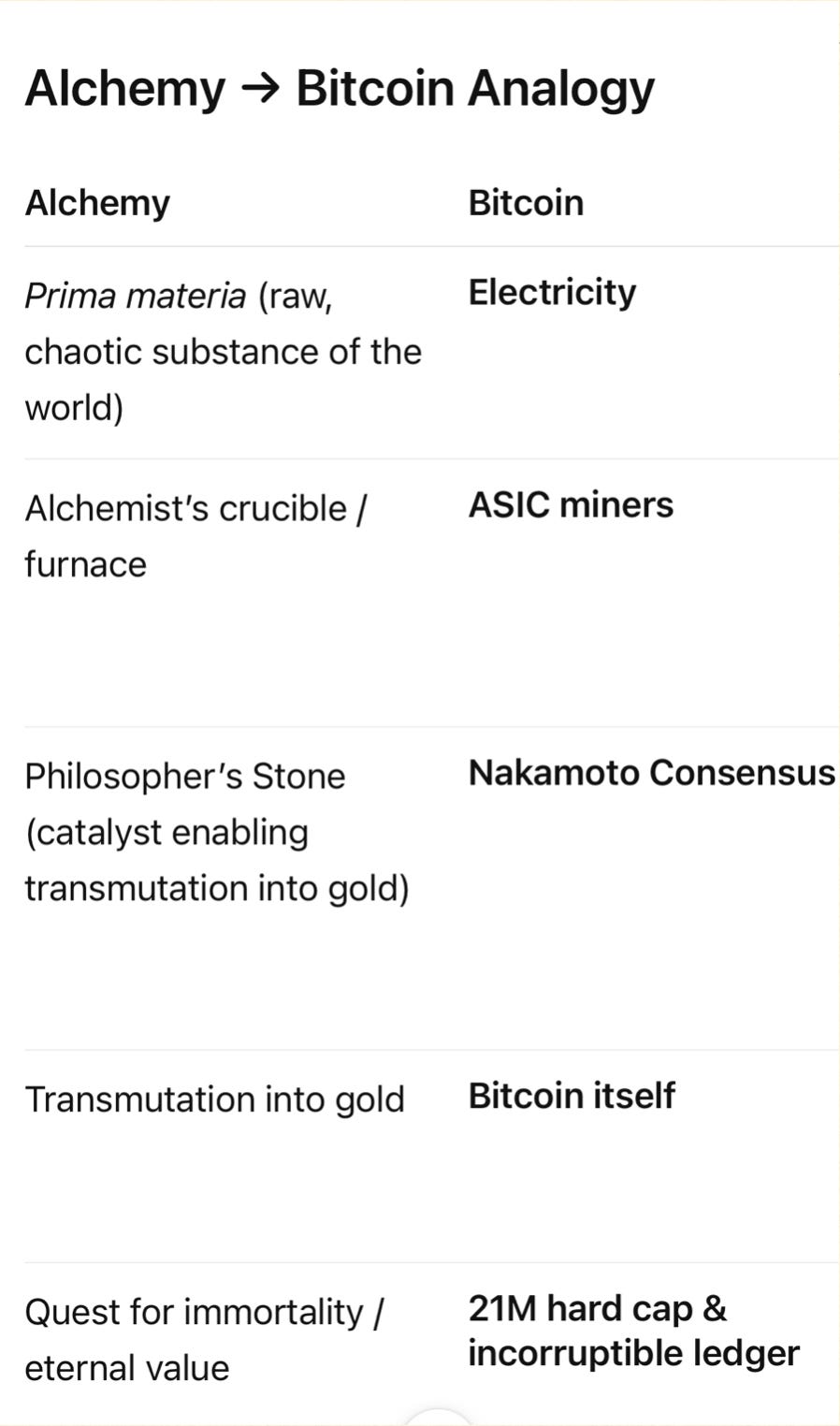 Here’s a summary table for the Bitcoin analogy to alchemy that I put together with the assistance of GPT5.
